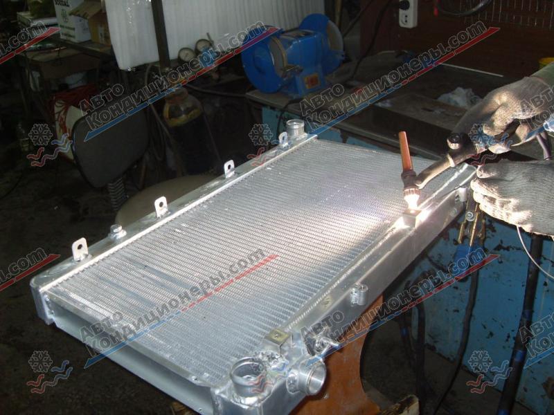 Поскольку алюминий под воздействием кислорода моментально образует на поверхности оксидную плёнку, сварка трубок автокондиционера выполняется в нейтральной газовой среде, т.е. с обдувом аргоном. Работа выполняется с использованием специального оборудования и требует от сварщика высокого профессионализма. Сварной аппарат образует электрическую дугу между свариваемым участком и вольфрамовым электродом аппарата. Высокая температура в месте контакта дуги с металлом приводит к расплавлению повреждённого участка трубки и присадочной проволоки, в результате чего отверстие или трещина закрывается сварным швом. Затраты на сварку невысоки, и в результате получается шов, не уступающий по прочности стенкам трубки. Завариванию подлежат относительно небольшие отверстия или трещины шириной не больше 2-3 мм.