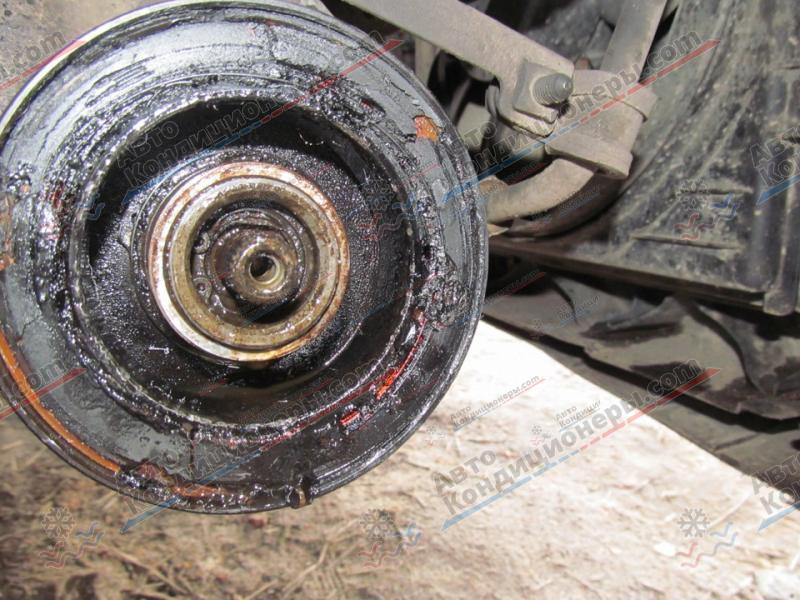 - заклинивание компрессора, в результате чего прижимная перестала вращаться, а шкив продолжал вращение, до тех пор пока от нагрева не перегорел электромагнит и не разомкнул цепь.