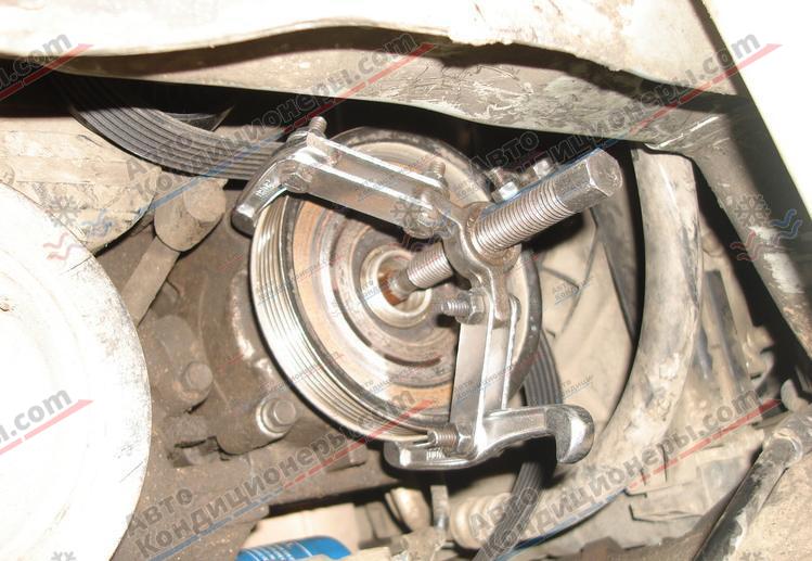 - далее, демонтируется стопорное кольцо, фиксирующее шкив на шейке компрессора. Шкив снимается вместе с подшипником, также специальными съемниками, которые позволяют равномерно распределить усилие по шкиву при его снятии. Съемник позволяет удобно и без повреждений снять шкив с шейки компрессора.