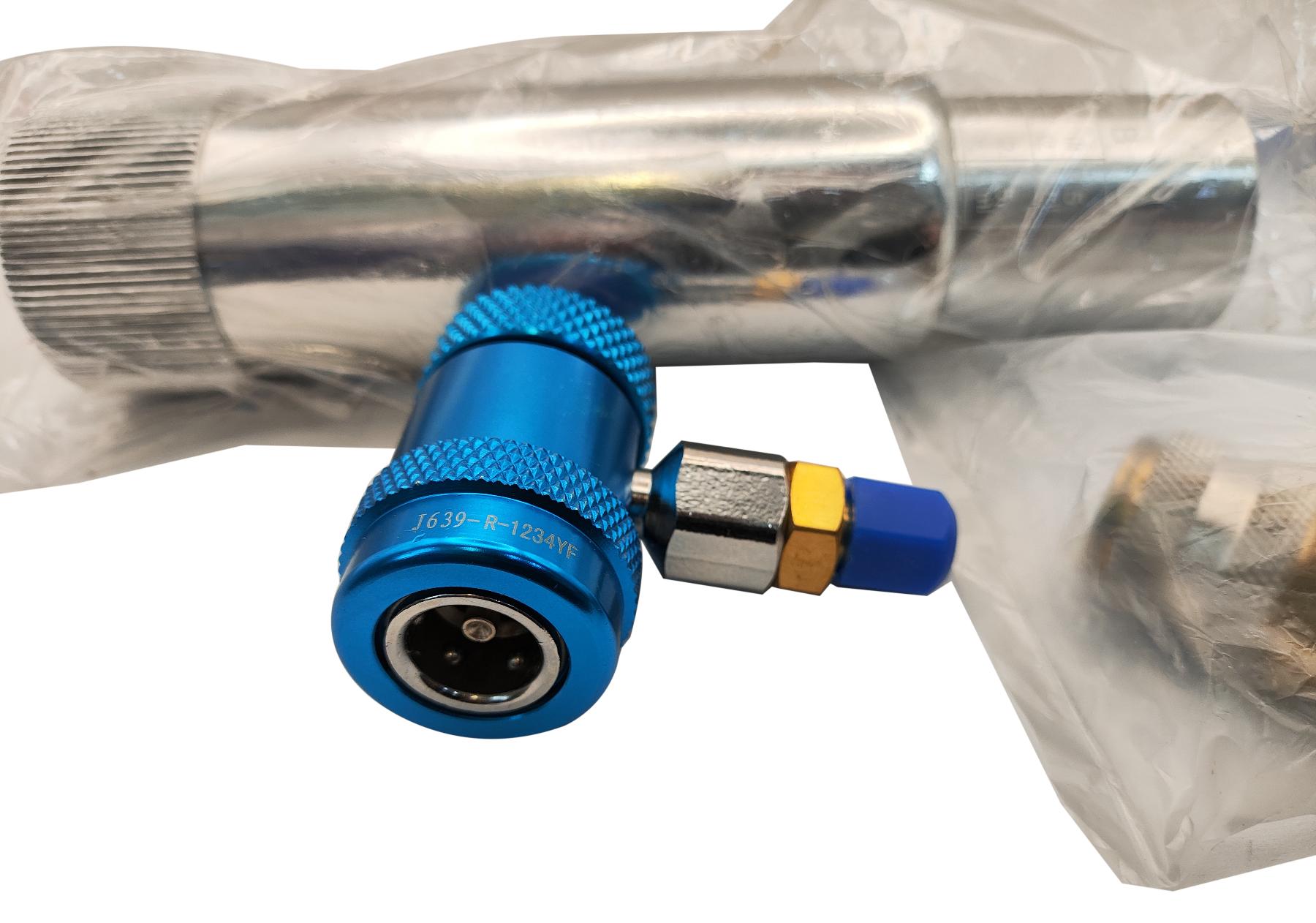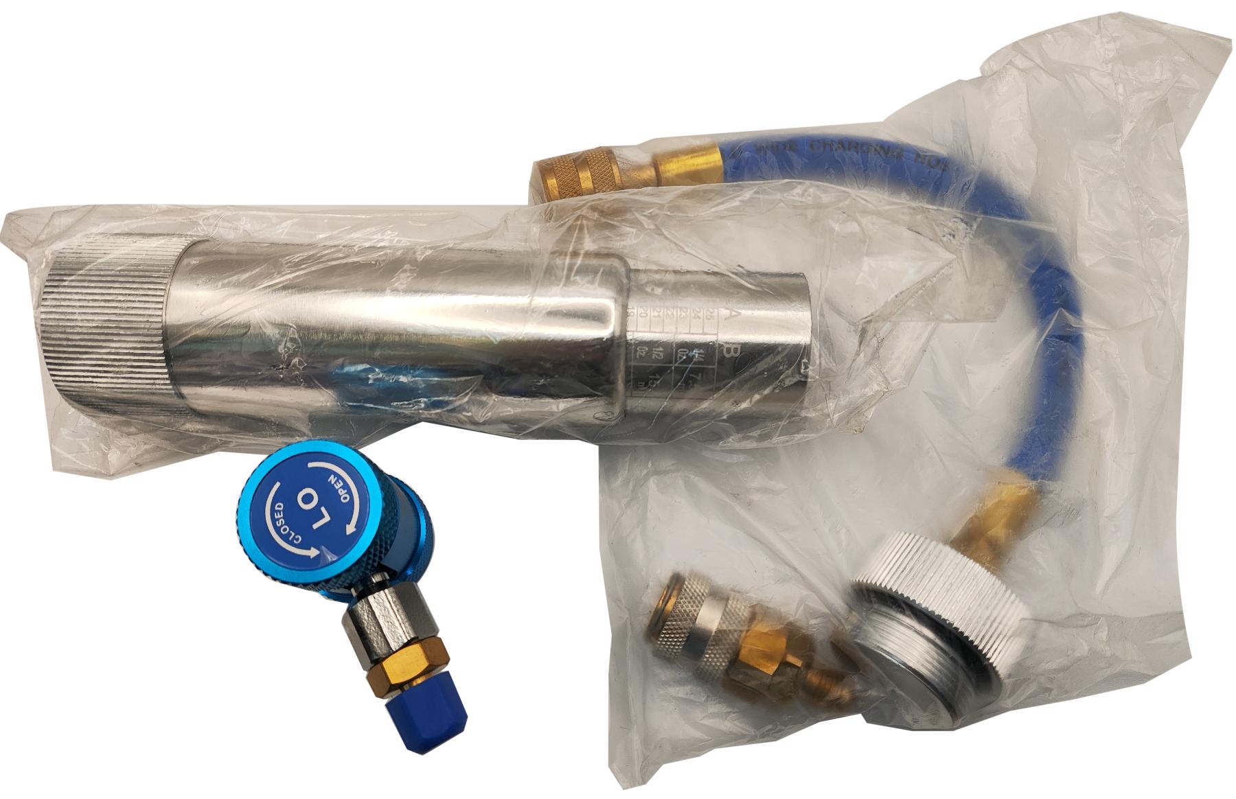 Инжектор для заправки ультрафиолетовой жидкости и/или масла применимых с фреоном R12, R134A, R1234yf. Позволяет залить в систему автокондиционера масло и/или ультрафиолетовую жидкость.