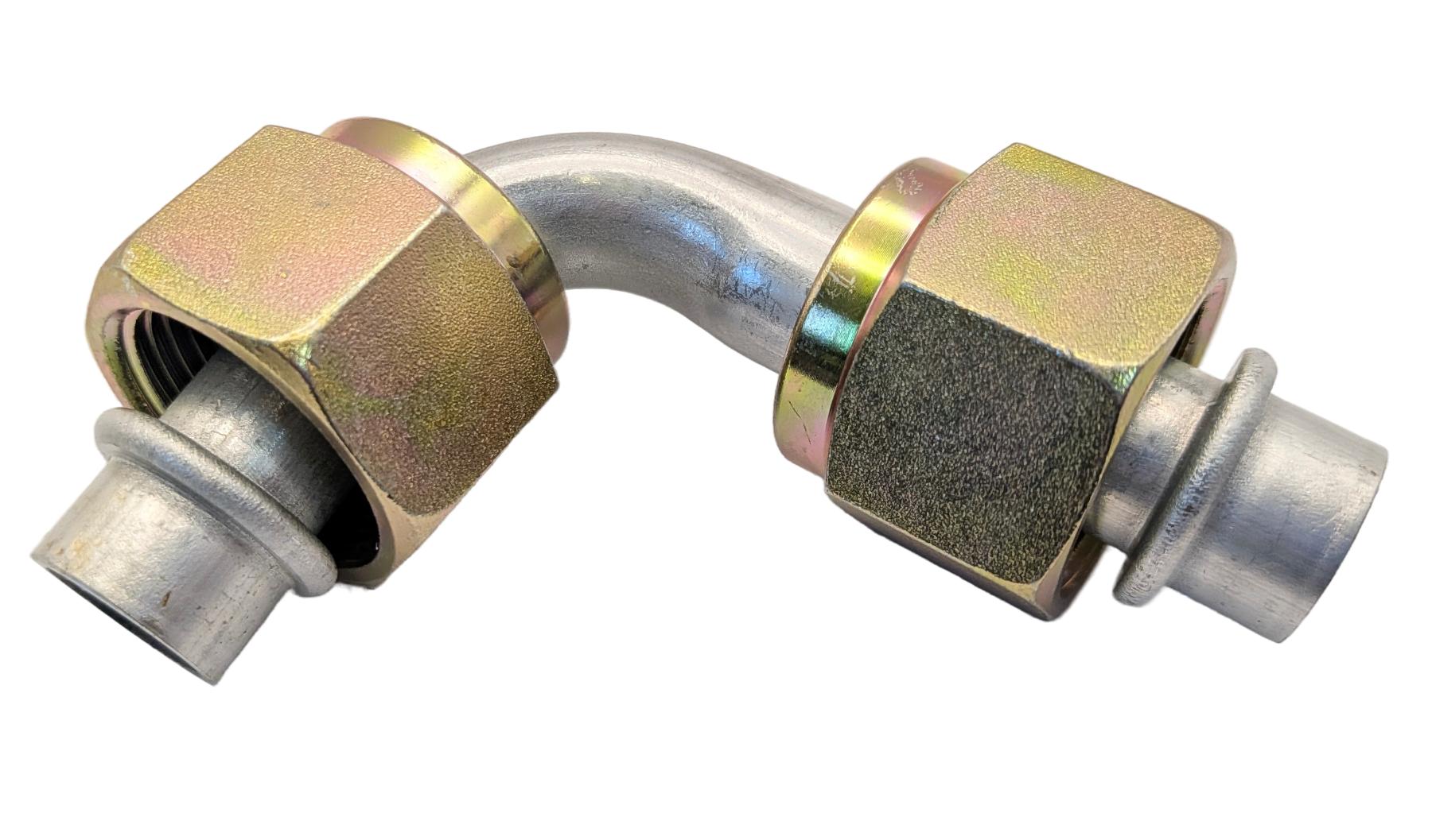 Фитинг для системы автокондиционера. Угловой, двусторонний, для трубки с диаметром 16мм G12, дюймовая резьба. Используется для соединения двух частей магистрали в узком пространстве.