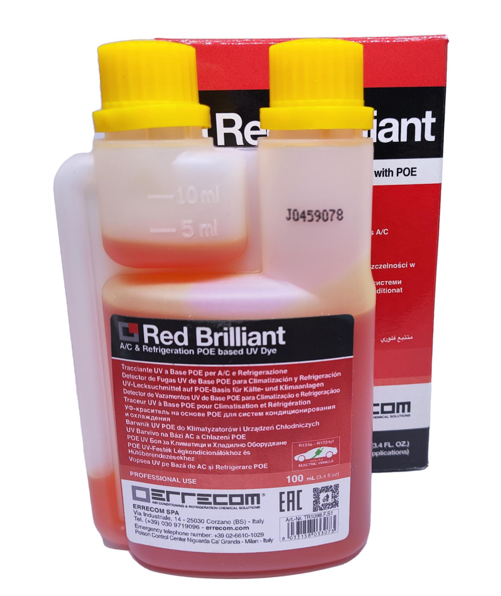 Errecom Red Brilliant - проверенный ультрафиолетовый краситель для поиска утечек в системе кондиционирования. Ультрафиолетовая жидкость (uv-жидкость) позволяет обнаружить микроскопические утечки в системе автомобильного кондиционирования. Особенность данного красителя в том, что его МОЖНО использовать в системах с фреоном R1234yf и маслом POE, а также в гибридных авто и электромобилях, т.к. данная флюра является диэлектриком. Также ее можно использовать с обычным фреоном R134. Используется ТОЛЬКО с маслами POE. Для PAG масел используется другой краситель. Заправляется в систему вместе с маслом. Для поиска утечек нужны ультрафиолетовые очки и фонарь.