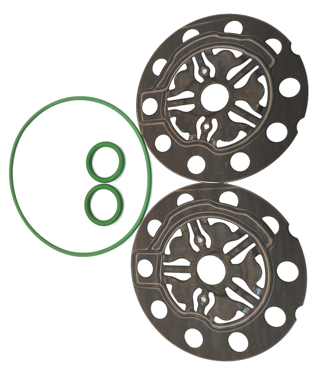 Ремкомплект прокладок для компрессора кондиционера Ford FoMoCo FS10 (фигурные прокладки надо СВЕРЯТЬ. Есть вариант компрессора с ними, есть без них). Резиновые уплотнители из резины повышенной выносливости HNBR. Производство Omega / Santech, США.