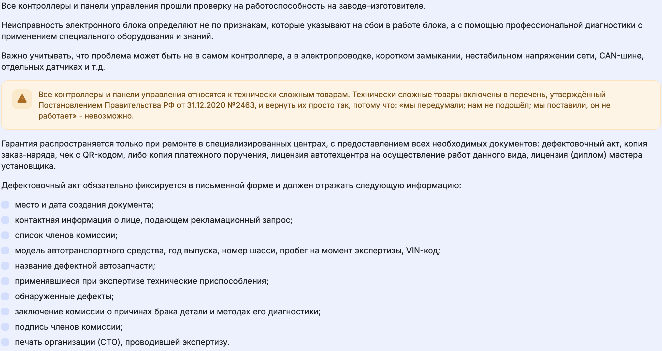 4.3.5. Заключение Сервиса о причинах неработоспособности товара (Акт дефектовки), выполненное на фирменном бланке, подписанное уполномоченным лицом Сервиса, с указанием используемого при диагностики оборудования с подтверждением соответствия оборудования установленным ГОСТам.