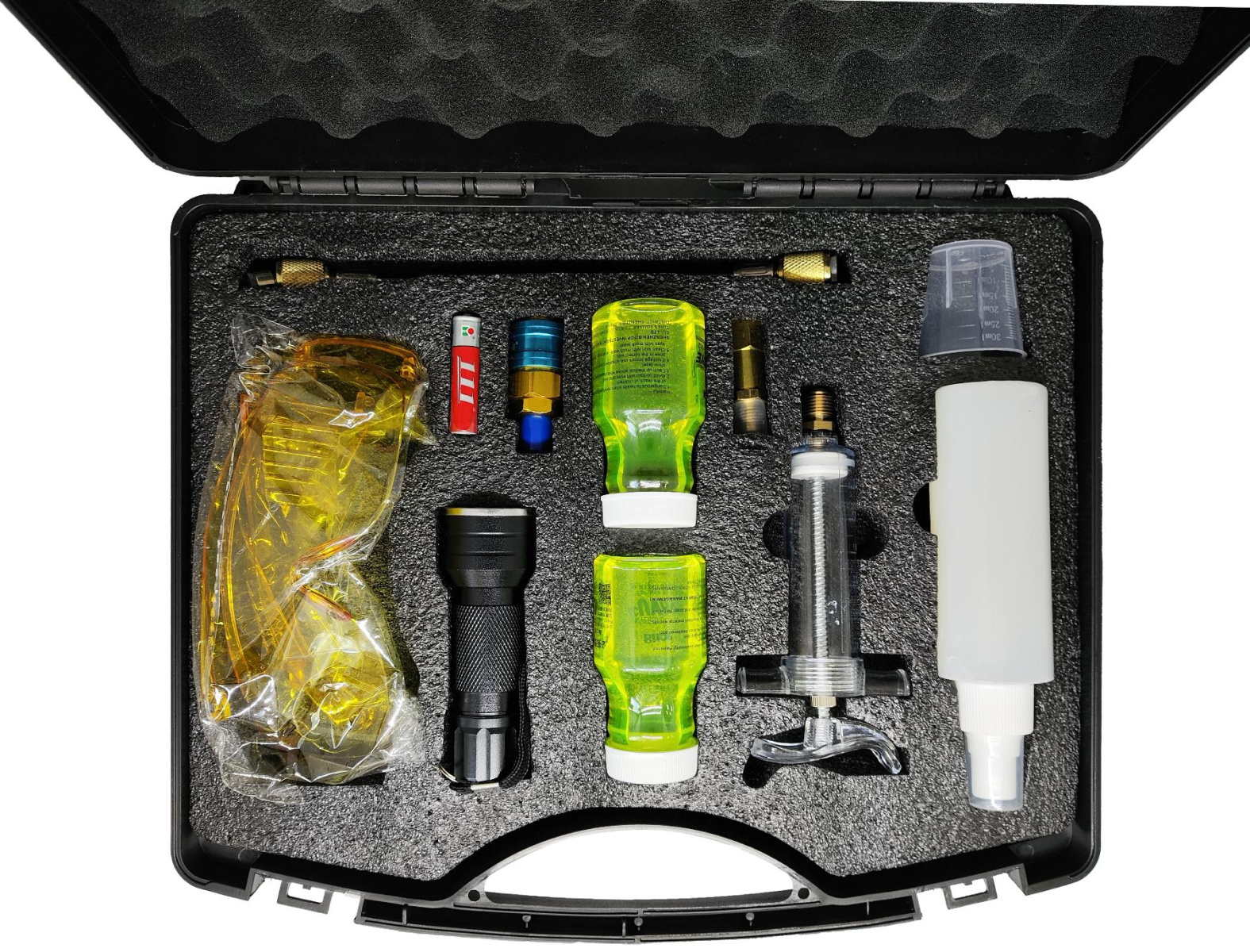 Набор для поиска утечек в кейсе. В комплект входит ультрафиолетовая жидкость, защитные очки, фонарик, батарейки для фонарика, шприц и переходники для ввода ультрафиолетовой жидкости в систему.