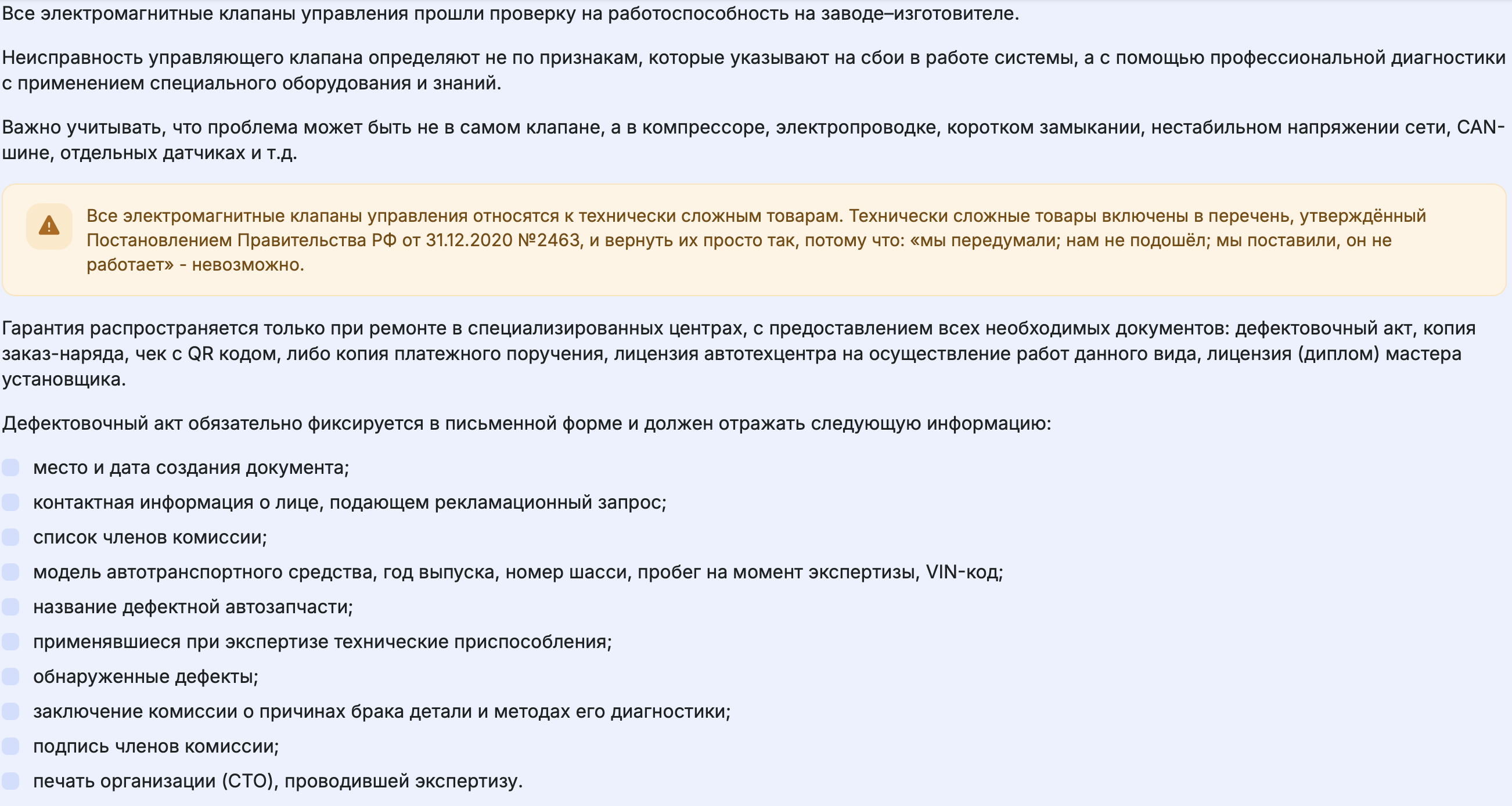 • неисправности Товара, применяемого в системе кондиционирования автотранспортного средства, вследствие использования некачественного фреона и масел.