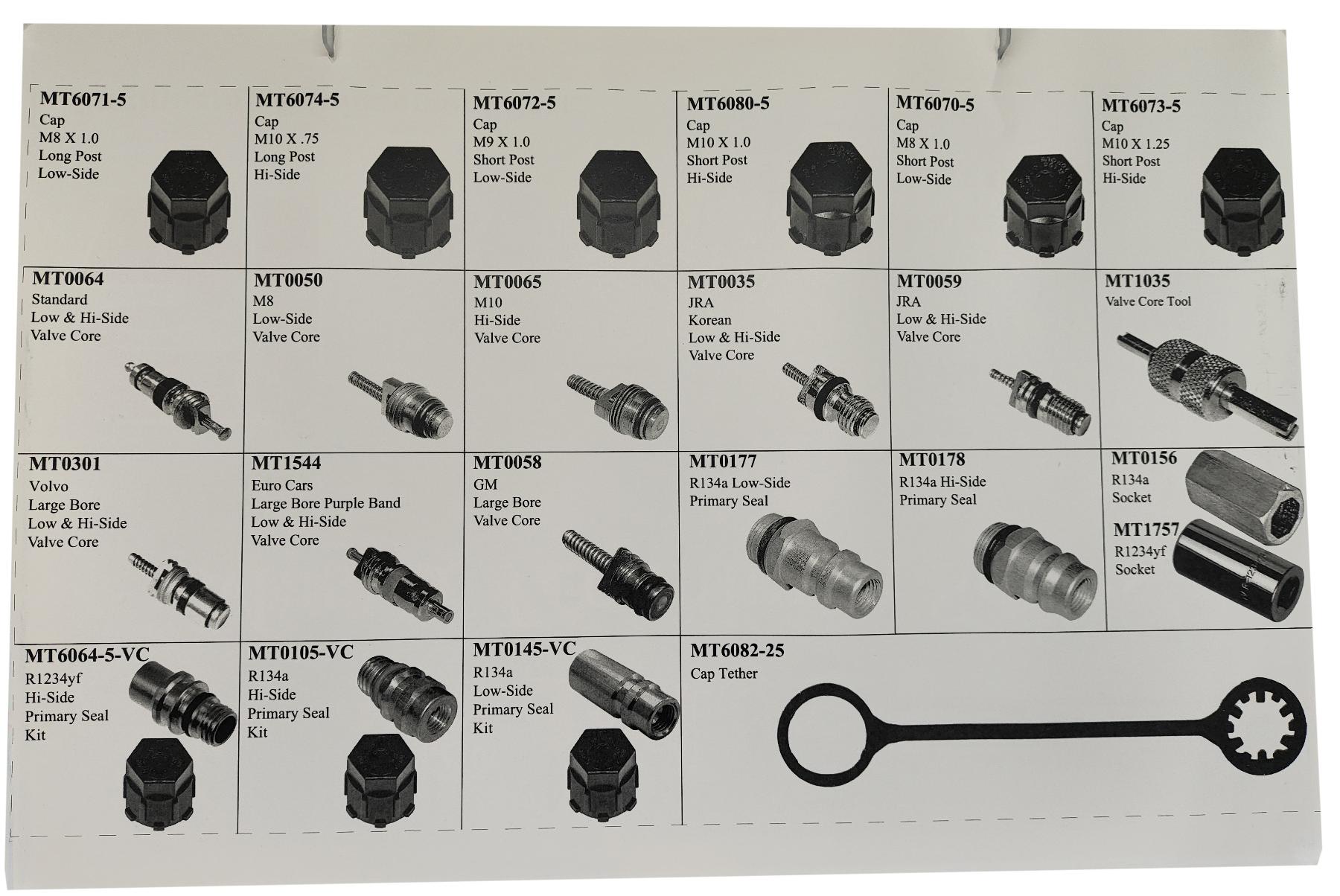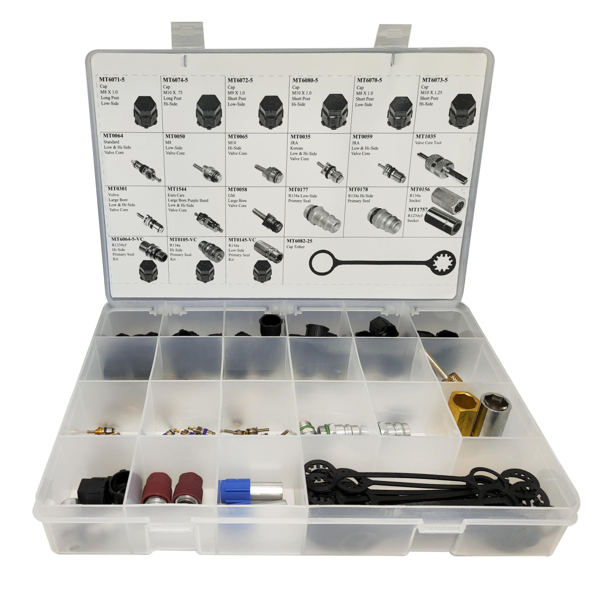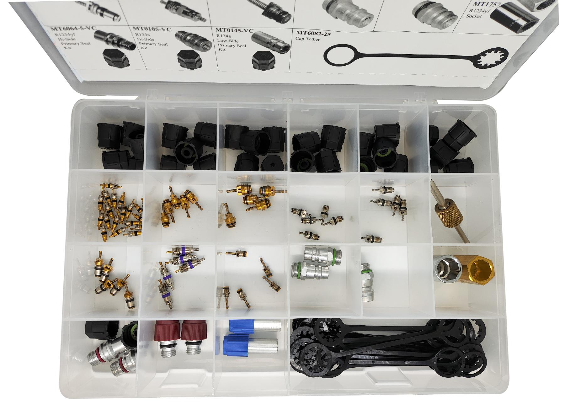Набор для обслуживания автокондиционерной системы при заправке автомобиля. В набор входят золотники универсальные, съемник для золотников, колпачки для систем с фреоном 1234yf, съемники для заправочных штуцеров под фреон 134a и 1234yf, заправочные штуцеры для фреона 134a и 1234yf, в том числе штуцер AcDelco 15-51312, 22748614.